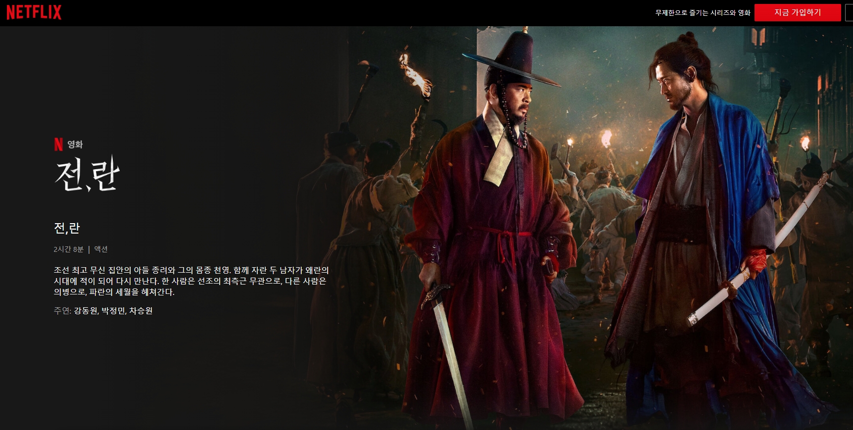 넷플릭스 한국 오리지널 영화 전,란은 조선시대 배경의 사극 액션으로, 강동원과 박정민이 출연하는 이 영화는 박찬욱이 제작을 맡은 작품입니다. 부산국제영화제에서 개막작으로 선정되었으며, 청소년 관람불가 등급을 받았습니다.