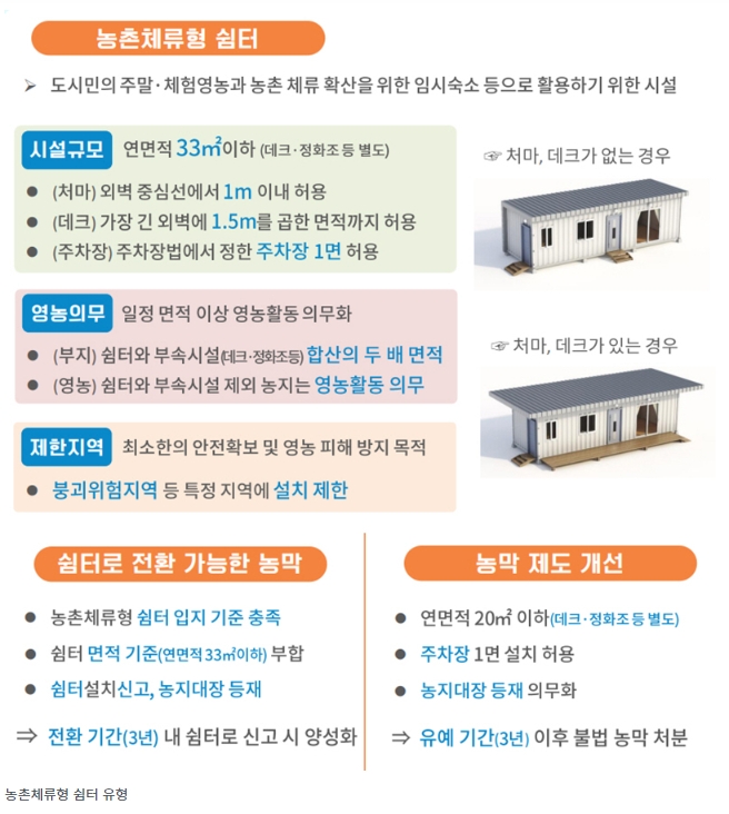 정부는 2024년 12월부터 본인 소유의 농지에 직접 사용하는 것을 원칙으로 숙박이 가능한 ‘쉼터’ 설치를 허용합니다. 기존 농막은 숙박이 원칙적으로 불가능했으나, 새롭게 도입되는 쉼터에서는 취사와 취침이 가능합니다. 이러한 체류형 쉼터가 활성화되면 주말을 기해 도시에서 농촌으로 이동해 생활하는 인구가 확대될 것으로 기대됩니다.