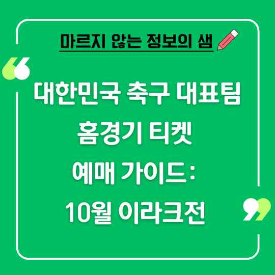 대한민국 축구 국가대표팀의 10월 A매치 이라크전 홈경기가 다가오고 있습니다. 팬들을 위한 티켓 예매 방법과 경기 일정을 안내해 드립니다. 손흥민의 출전 여부도 함께 확인하세요!