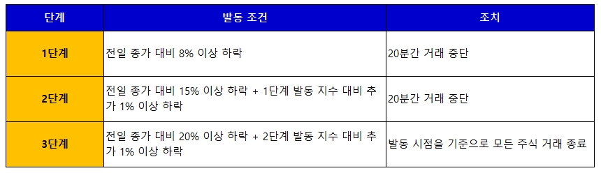 1단계 서킷브레이커는 전일 종가 대비 8% 이상 하락할 경우 20분간 거래를 중단하며, 2단계는 전일 종가 대비 15% 이상 하락하고 1단계 발동 지수 대비 추가로 1% 이상 하락할 경우 20분간 거래를 중단합니다. 마지막으로 3단계는 전일 종가 대비 20% 이상 하락하고 2단계 발동 지수 대비 추가로 1% 이상 하락할 경우 발동되며, 이 경우 발동 시점을 기준으로 모든 주식 거래가 종료됩니다.