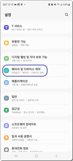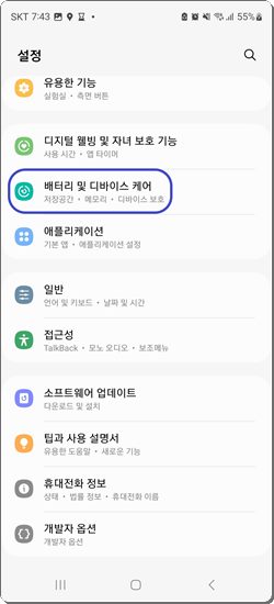 - 설정 메뉴로 이동: '설정' 메뉴로 이동하여 '배터리 및 장치 케어' 또는 '장치 유지 관리'를 선택합니다.