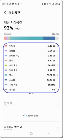 - 캐시 데이터 정리: 저장공간을 선택한 후 그동안 저장되어있던 이미지와 동영상중에 더이상 보관할 필요가 없는 것들을 삭제해 주세요.