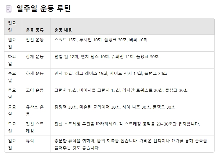 초보자를 위한 홈트 루틴: 1주일 운동 계획으로 쉽게 시작하세요. 체력 향상과 건강 유지를 위한 필수 운동 루틴과 팁을 제공합니다.
