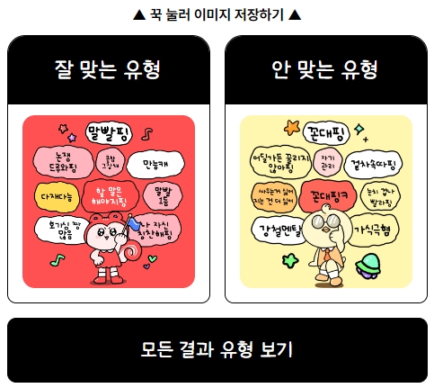 이번에는 그 인기에 힘입어 MBTI 성격 유형을 기반으로 한 테스트가 등장했습니다. MBTI 테스트는 많은 사람들에게 익숙한 성격 유형 분석 도구입니다. 그런데 여기서 특이한 점은, 자신의 MBTI 성향을 캐치 티니핑 캐릭터와 연결해 나만의 핑 유형을 찾아볼 수 있다는 것입니다. 재미와 심리 분석을 결합한 이 테스트는 이미 수많은 사람들 사이에서 화제가 되고 있습니다.