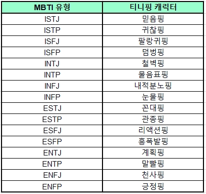 테스트 결과는 16가지의 핑 캐릭터로 나뉩니다. 각 캐릭터는 MBTI 성향에 맞추어 개성을 표현합니다. 다음은 주요 핑 유형입니다: