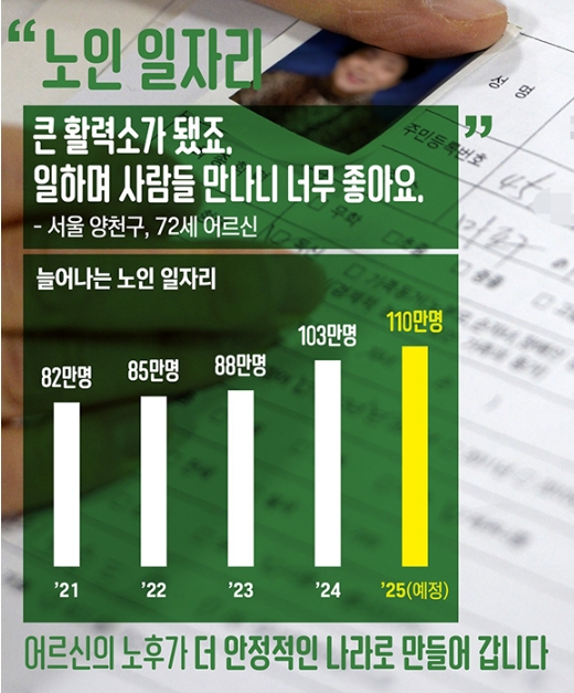 올해 이 프로젝트는 전년도에 비해 68,000개 증가한 109만 8천개의 일자리를 제공할 것입니다. 1,585억 원의 예산 증액으로 전국 노인 지원 강화를 약속합니다.